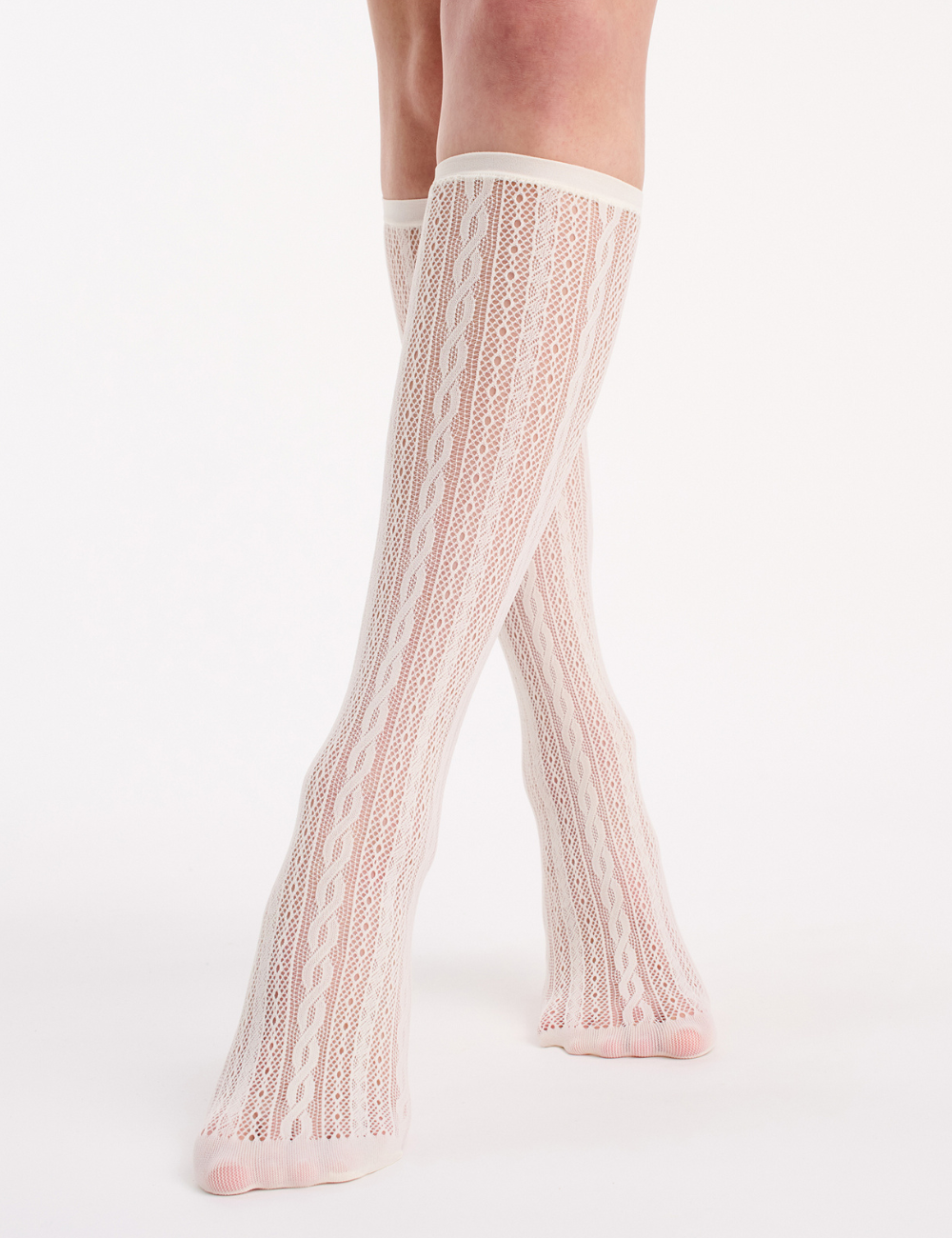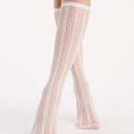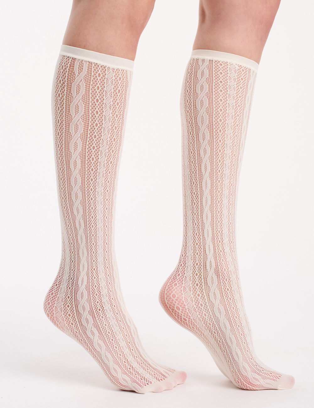 Enhance your wardrobe with our Lace Net Knee-High. Showcasing a beautiful fusion of pointelle and cable patterns, these socks feature delicate lace netting, adding a unique and feminine touch to any outfit. The knee-high length offers both function and style, making them ideal for pairing with dresses, skirts, or boots.